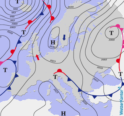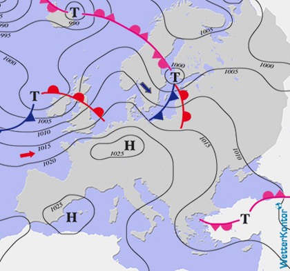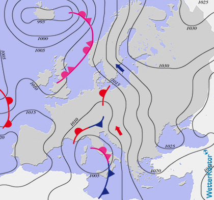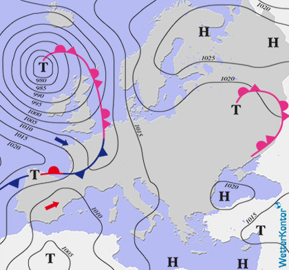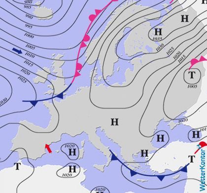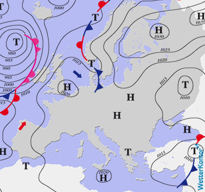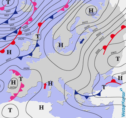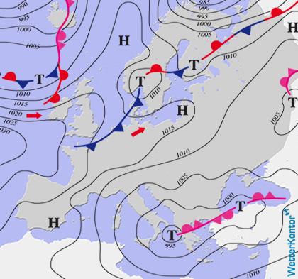 In der Europa-Bodenkarte sind zudem rote Warm- und blaue Kaltluftpfeile eingetragen, die die Bewegung von warmer und kalter Luft kennzeichnen. Bei den dünnen schwarzen Linien handelt es sich um Isobaren, Linien gleichen Luftdrucks. Je dichter die Isobaren beisammen liegen, desto stärker weht der Wind in dieser Region. Aus der Lage der Hoch- und Tiefdruckgebiete kann man zudem die Windrichtung ermitteln, im Tief weht der Wind gegen den Uhrzeigersinn, im Hoch mit dem Uhrzeigersinn. Beispielsweise können Segler aus dieser Karte die zu erwartende Windrichtung und -geschwindigkeit ablesen.