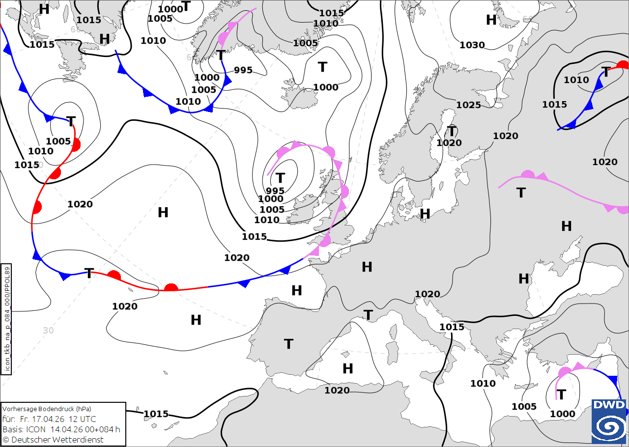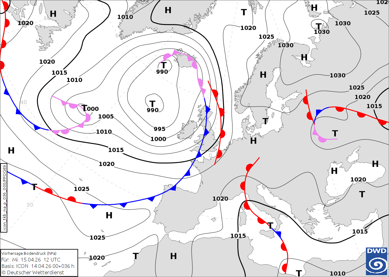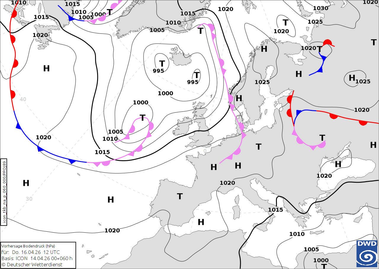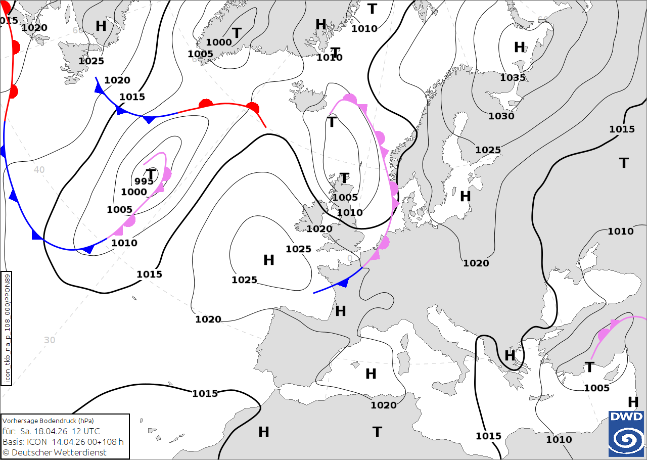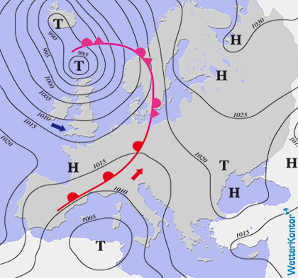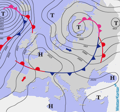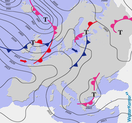 Eine blaue Linie mit Dreiecken stellt eine Kaltfront dar, d. h. kalte Luft dringt gegen warme Luft vor. Dazu gibt es noch die Warmfront als rote Linie mit Halbkreisen, bei der sich die warme Luft gegen vorgelagerte kalte Luft in Bewegung setzt. Da die warme Luft leichter ist als die kalte Luft, gleitet sie langsam auf die kalte Luft auf. Die dritte meteorologische Front ist die Okklusion, praktisch ein Zusammenschluss aus Kalt- und Warmfront. Die Kaltfront ist schneller als die Warmfront und holt diese im Laufe der Entwicklung des Tiefdruckgebietes ein. Die Okklusion wird in der Farbe lila durch eine Kombination von Dreiecken und Halbkreisen markiert. Zusätzlich erscheinen in den Bodenwetterkarten vor allem in den Sommermonaten noch mit Federn gekennzeichnete gelbe Linien. Sie markieren sogenannte Konvergenzlinien, an der in den unteren Schichten Luft aus verschiedenen Richtungen zusammenströmt und aufsteigt. So können sich im Bereich dieser Konvergenzlinien bevorzugt kräftige Schauer und Gewitter entwickeln. Üblicherweise entstehen Konvergenzlinie im Warmluftbereich vor einer Kaltfront.